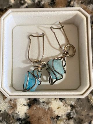Orecchini pendenti vintage Larimar Orecchini pendenti vintage Larimar Peso gr. 1.54 Lunghezza cm. 2.8 ap. Montatura Metallo argentato Chiusura Moschettone Pietra Larimar