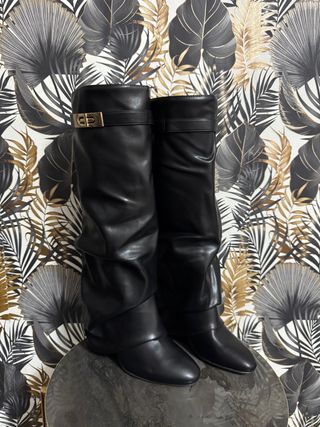 Botas altas de cuero sintético negro con detalle de candado. Disponibile numero 36,37,39 - Diseño arrugado. - Tacón fino. - Punta afilada.