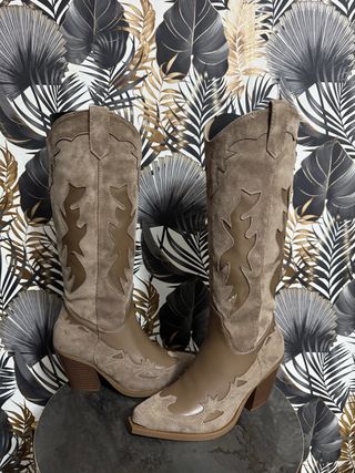Botas de estilo campero en color beige. Un clásico que nunca pasa de moda. - Diseño con bordados. - Tacón de bloque. - Caña alta. - Numero 39