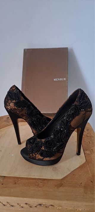Eleganti scarpe décolleté con tacco alto. - Dettagli in pizzo floreale. - Inserti glitterati. - Punta aperta. Non ci sono imperfezioni, però per correttezza scrivo che ci possono essere imperfezioni di conservazione.