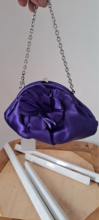Elegante pochette AVANCE color viola, perfetta per occasioni speciali. - Tessuto satinato con dettagli floreali. - Chiusura a scatto. - Catena metallica rimovibile. Non ne ha segni di conservazione però per correttezza lo dico disponibile tre pezzi.