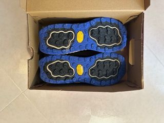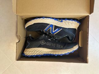 Scarpe da trail running New Balance Hierro v7. Usate solo per fare due passi ma le vengo perché mi vanno piccole. - Modello Gore-Tex impermeabile. - Design con tomaia in mesh traspirante. - Suola Vibram per un'ottima aderenza. - Dettagli a contrasto blu e oro.