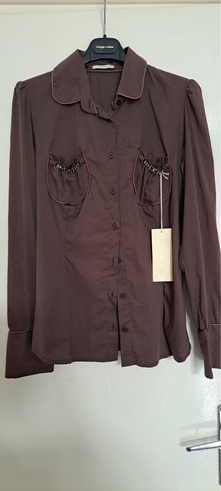 Camicia marrone con dettagli curati. - Collo a punta. - Chiusura con bottoni. - Due taschini sul petto con decorazioni. - Polsini con bottoni. potrebbe avere segni di conservazione.