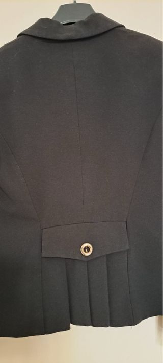 Elegante giacca nera. - Chiusura con bottone dorato. - Tasche frontali con patta e bottone dorato. - Scollo a V con revers.