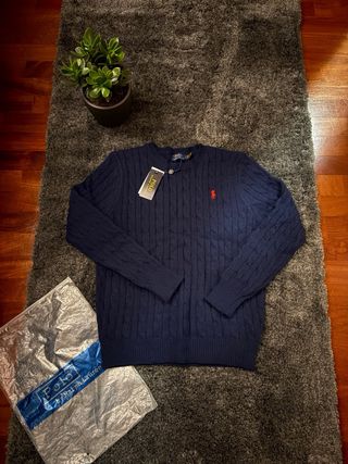 Maglioncino Polo Ralph Lauren con trama a trecce. - Colore blu intenso. - Logo del cavallino rosso ricamato sul petto. - Maniche lunghe e girocollo.