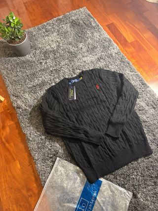 Maglioncino Polo Ralph Lauren in maglia a trecce. - Colore nero. - Logo pony rosso ricamato sul petto.
