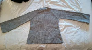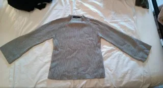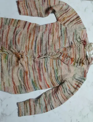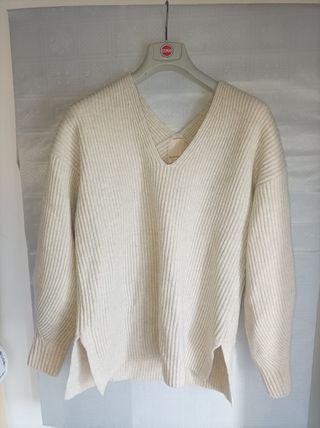 Vendo maglione avvolgente **H&M**, color panna/off-white, caratterizzato da una lavorazione a coste verticali. Il capo presenta: -Doppio scollo a V (sia sul fronte che sul retro) che slancia la figura. -Linea morbida con spacchetti laterali sul fondo, perfetto da portare sopra leggings o jeans skinny. -Ottima composizione in **65% Lana e 35% Poliammide** (come da etichetta), che lo rende caldo, soffice e di qualità superiore rispetto ai classici capi sintetici. - taglia S (veste comodamente anche una M data la linea rilassata). Ottime condizioni, trama della lana ben conservata e colore vivido S0103