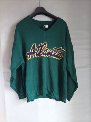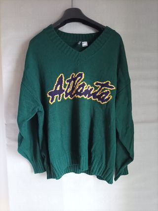 Maglione sportivo a marchio H&M (linea Divided) in una vibrante tonalità verde bosco. Il capo si distingue per la grande scritta "Atlanta" ricamata sul petto con rilievo tipo spugna (chenille patch) nei colori blu navy, giallo e bianco, che conferisce un perfetto stile college/varsity. Dettagli: Scollo a V profondo con spessa bordatura a coste. Polsini e orlo inferiore ampi e strutturati. Condizioni: Ottime, i ricami sono integri e il colore è vivido. Vestibilità: Taglia L. Il taglio è rilassato con spalle scese (dropped shoulders), tipico dello stile streetwear contemporaneo. S01-23
