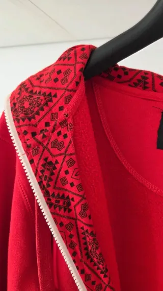 Maglione a girocollo firmato Zara, dal carattere deciso grazie al contrasto cromatico tra rosso acceso e nero. Il dettaglio distintivo è rappresentato dai volant applicati sulle spalle, che donano volume e un tocco romantico-dark al capo. Modello: Trama a righe orizzontali, maniche lunghe con polsini elasticizzati a costine e fondo coordinato. Dettagli estetici: Le ruches sulle spalle creano una silhouette strutturata, perfetta per outfit in stile grunge o alternative chic. Condizioni: Ottime condizioni generali. Vestibilità: Taglia M (EUR/USA M). Vestibilità regolare, confortevole grazie al mix di acrilico e poliammide. S01-19
