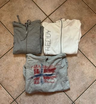 Set di tre felpe da donna. - Felpa grigia Pimkie con zip e cappuccio. - Felpa bianca con zip e logo Freddy (con piccola macchia removibile come da foto) - Felpa grigia con stampa bandiera Napapijri.