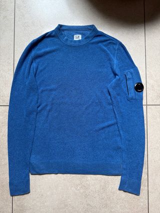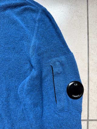 Maglione C.P. Company di colore blu. - Logo C.P. Company sul colletto. - Tasca applicata sulla manica sinistra con lente. - Tessuto morbido e confortevole.
