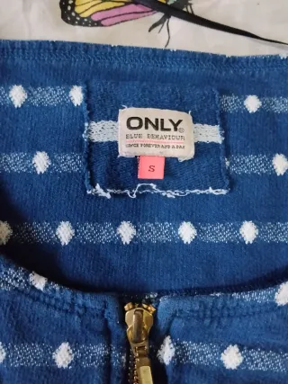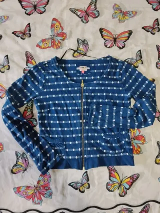 Maglioncino con zip frontale e fantasia a pois. - Fantasia a righe e pois bianchi. - Zip dorata. - Tasche frontali. - Collo rotondo.