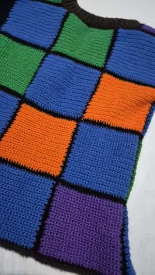 Maglione artigianale con un design a patchwork colorato. Le maniche presentano un motivo a fiori all'uncinetto. - Patchwork di quadrati colorati. - Maniche lunghe con decorazioni floreali. - Collo rotondo.