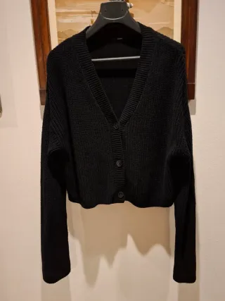 Cardigan Tezenis nero, taglia L. Realizzato in misto cotone e acrilico. - Scollo a V. - Chiusura con bottoni. - Maniche lunghe. - Lunghezza cropped. Senza tasche. Largo 53. Lungo 50
