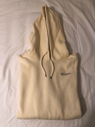 Sudadera con capucha de la marca Troppo en color beige. Es una prenda cómoda y versátil. - Capucha con cordones. - Bolsillo frontal.