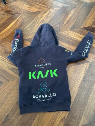 Felpa con cappuccio del marchio Equestro, con dettagli colorati. - Logo KASK sul petto. - Scritta stubben sulla manica sinistra. - Scritta SPORTS sulla manica destra. - Cappuccio con ricamo dorato.