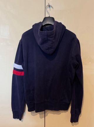 Felpa in cotone 100% di TOMMY HILFIGER, colore blu con dettagli rossi. Taglia M, perfetta per look casual e confortevoli. Ideale per le stagioni più fresche grazie al suo design comodo e al collo a mezza zip. In ottime condizioni, un must per gli appassionati del brand.
