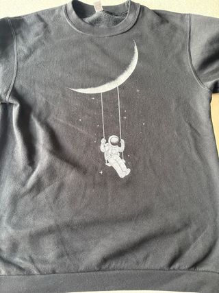 Felpa con stampa di un astronauta che dondola sulla luna. Felpa usata qualche volta ma in buone condizioni Indicate le misure della maglia e quelle del sito - Stampa dettagliata con luna crescente e stelle. - Design unico e originale.