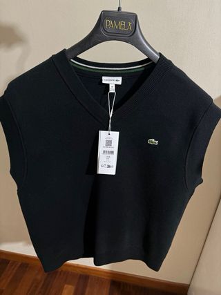 Gilet Lacoste con scollo a V, perfetto per un look casual o elegante. - Logo coccodrillo ricamato sul petto. - Rifiniture a costine sul giromanica e sul fondo. - Tessuto morbido e confortevole. Taglia 14A, ma veste come una S.