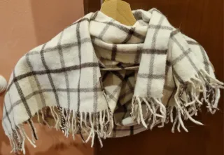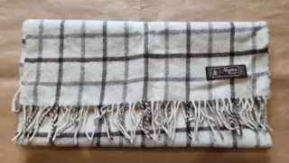 Sciarpa in alpaca con motivo a quadri e frange. - Materiale: 100% alpaca - Colore: base bianco panna con quadri marrone scuro - Lunghezza frange: circa 5 cm