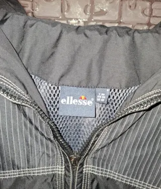 Giacca a vento vintage Ellesse, perfetta per un look sportivo e casual. - Design a blocchi di colore nero e grigio. - Dettagli a righe verticali. - Zip frontale completa. - Tasche laterali con zip.