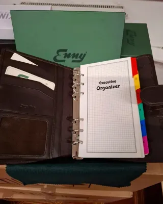Elegante organizer vintage Enny in pelle vitello fiore marrone, perfetto per tenere in ordine i tuoi appuntamenti e note. - Design classico e raffinato. - Interni con tasche porta carte e documenti. - Fogli a quadretti per appunti. - Divisori colorati per sezioni.