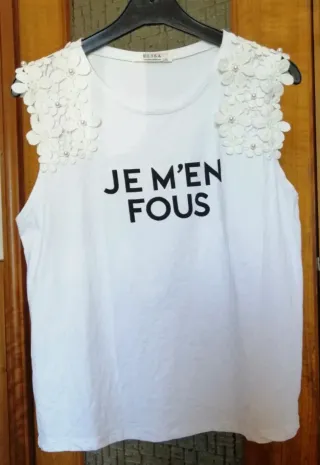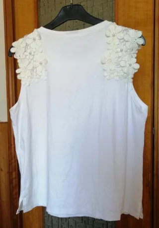 T-shirt Elisa bianca con dettagli floreali e perle sulle spalle. Un capo unico e originale. - Maniche corte. - Scollo rotondo. - Decorazioni floreali in tessuto. - Applicazione di perle decorative.