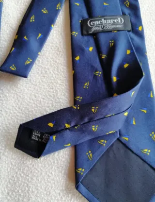 Cravatta vintage Cacharel in seta con fantasia. 5 pezzi disponibili. Prezzo per singolo pezzo. Sconti per acquisti multipli - Fantasia con barchette e triangoli. - Colori predominanti blu e giallo.