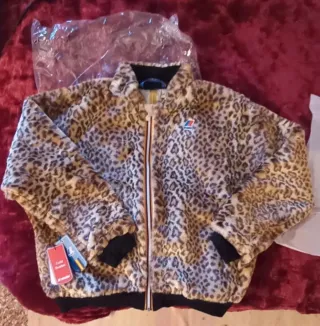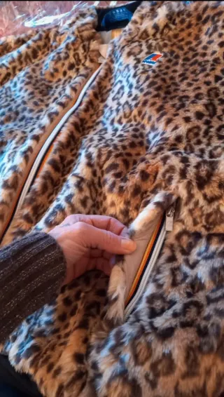 Giacca modello bomber K-Way con stampa leopardata effetto teddy. - Fantasia animalier. - Collo alto. - Zip frontale. - Polsini e fondo elasticizzati. - Slim fit. - Nuovo con etichette. - Originale.