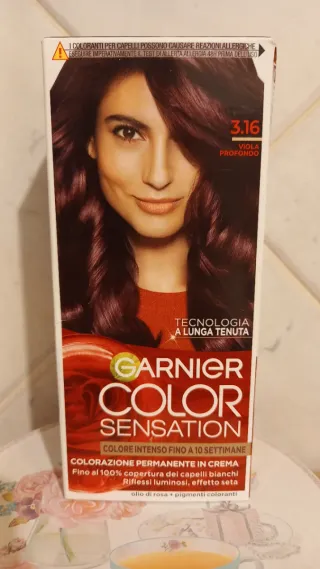 Tinta permanente per capelli Garnier Color Sensation, tonalità 3.16 Viola Profondo. - Colore intenso fino a 10 settimane. - Copertura 100% dei capelli bianchi. - Riflessi luminosi e effetto seta. - Formula in crema con olio di rosa e pigmenti coloranti.