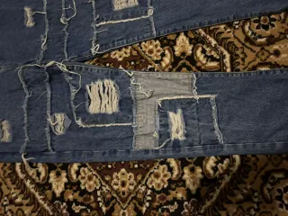 Jeans baggy con un design unico e moderno, perfetti per un look casual. - Vestibilità ampia e comoda. - Dettagli strappati e patchwork. - Tessuto resistente. Presso contratto fino a 25 euro