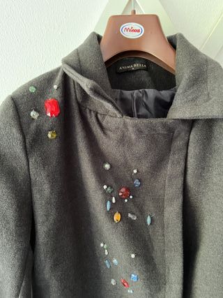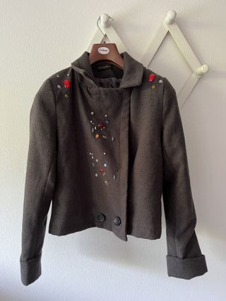 Elegante chaqueta de paño suave con detalles de pedrería. - Diseño con cuello - Cierre cruzado - Adornos de pedrería y cristales de colores - Puños vueltos