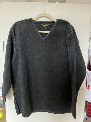 Sudadera de manga larga con cuello en V y un diseño moderno. - Costuras exteriores visibles. - Bajo con aberturas laterales.