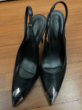 Eleganti slingback nere con punta metallica. - Dettaglio punta in metallo argentato. - Cinturino elastico posteriore. - Tacco a spillo.