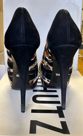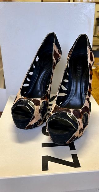 Eleganti décolleté Schutz con tacco alto, realizzate in camoscio e cavallino. - Design peep-toe. - Dettagli cut-out sui lati. - Finitura in pelle maculata.