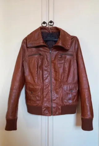 Giacca in vera pelle dal design classico. - Materiale: Vera pelle - Colore: Marrone - Chiusura con zip frontale - Tasche frontali con patta e bottone - Tasche sul petto con zip - Polsini e fondo in maglia a costine - Interno imbottito - Modello da pilota - Nuovo mai indossato