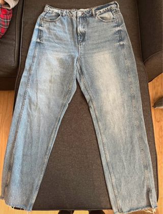 Jeans dritti dal taglio moderno. - Tessuto denim resistente. - Design a gamba dritta. - Dettagli sfrangiati sull'orlo. Taglia 48, usati ma in ottimo stato.