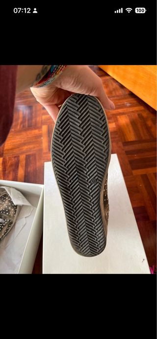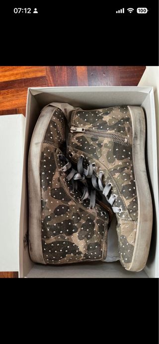 Scarpe alte con fantasia mimetica e strass. - Chiusura con lacci e zip laterale. - Suola in gomma. Effetto vintage. Usate ma ancora in ottime condizioni.