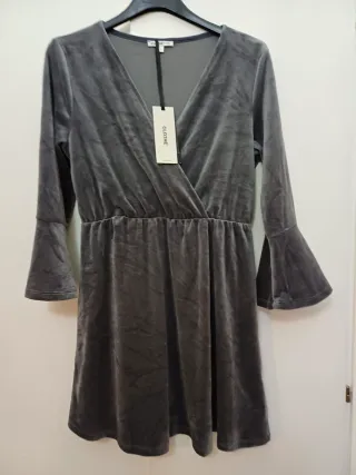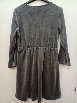Elegante abito in morbido velluto grigio. - Scollo a V. - Maniche a campana. - Elastico in vita.