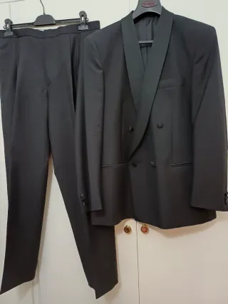 Elegante smoking Egon von Furstenberg. - Giacca doppiopetto con revers a lancia. - Pantaloni coordinati. - Colore nero.