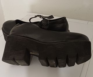 Eleganti scarpe con un design audace e moderno. Praticamente nuove. - Tomaia in ecopelle nera. - Cinturino con fibbia regolabile. - Suola platform spessa e robusta.