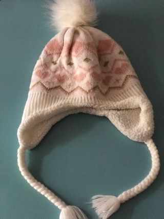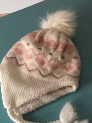 Morbido berretto invernale per bambina, perfetto per le giornate fredde. - Colore bianco e rosa con fantasia a cuori. - Pompon in pelliccia sintetica. - Paraorecchie con lacci e nappe. - Fodera interna in pile.