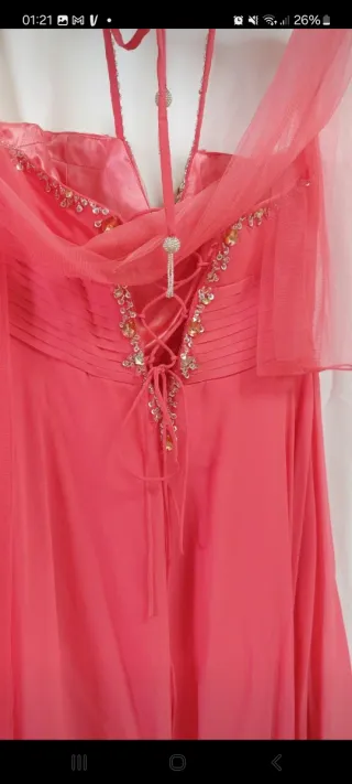 Elegante abito da cerimonia in un vivace color rosa corallo. Perfetto per occasioni speciali. - Taglio asimmetrico con strati di tessuto leggero. - Dettagli dorati sul corpetto e sulle spalline. Unico difetto manca qualche paietta tipo 2.3 E scucito leggermente all interno ma si cuce - Include un foulard coordinato.