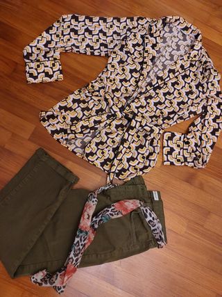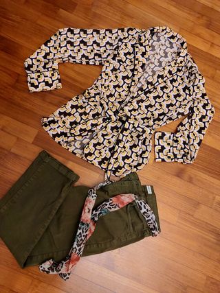 Set composto da jeans e una giacca. - Jeans in cotone di colore verde., elastico, lunghezza alla caviglia, foulard in vira fantasia animalier, brand Anyplace - Giacca con fantasia geometrica multicolore., brand Pimkie, taglia S, ma veste fino ad L, mai indossata.