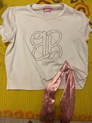 Maglietta bianca Barbie con dettaglio strass. - Logo EB con strass. - Tessuto morbido e confortevole. - Dettaglio nodo con foulard rosa.