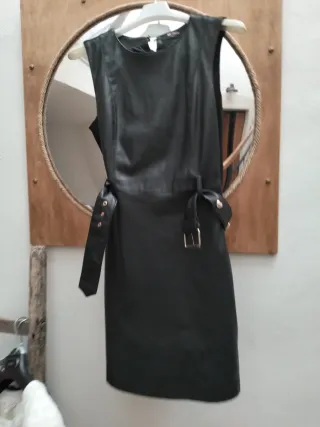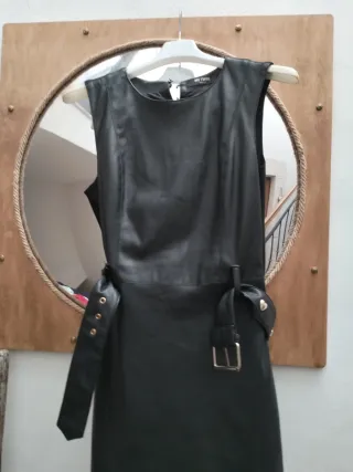 Elegante vestito in similpelle, perfetto per ogni occasione. - Design senza maniche. - Cintura in vita con fibbia e passanti. - Dettagli con borchie dorate sulla cintura. Piccole non evidenti segni di screpolatura intorno al collo mascherabili con un foulard o una collana