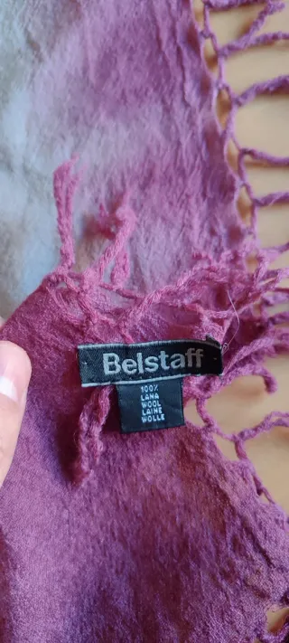 Vendo foulard in lana della marca Belstaff, totalmente originale, usato in buone condizioni, logo centrale con sfondo grigio pietra e estremità in un tono marrone con frange, taglia unica unisex