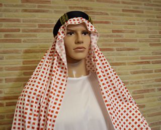 Costume completo di sceicco arabo, taglia XXL, composto da tunica bianca lunga, foulard con motivo a quadri rossi e bianchi e diadema nero con dettagli dorati. Usato una volta, lavato e in buone condizioni.
