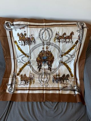 Elegante foulard vintage di Hermès con un design di carrozze e cavalli. 100% seta. Design dettagliato con scene equestri. Toni marroni e bianchi. Bordo distintivo.