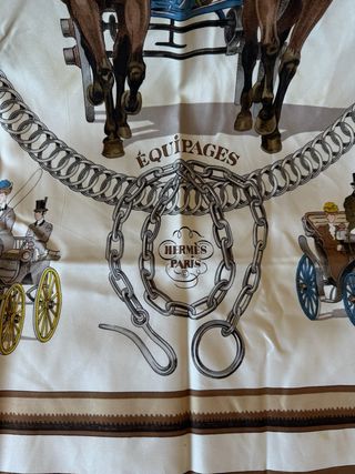 Elegante foulard Hermès in seta con un design ispirato alle carrozze e ai cavalli. - Motivo Équipages. - Firma Hermès Paris visibile. - Disegnato da Ledoux.